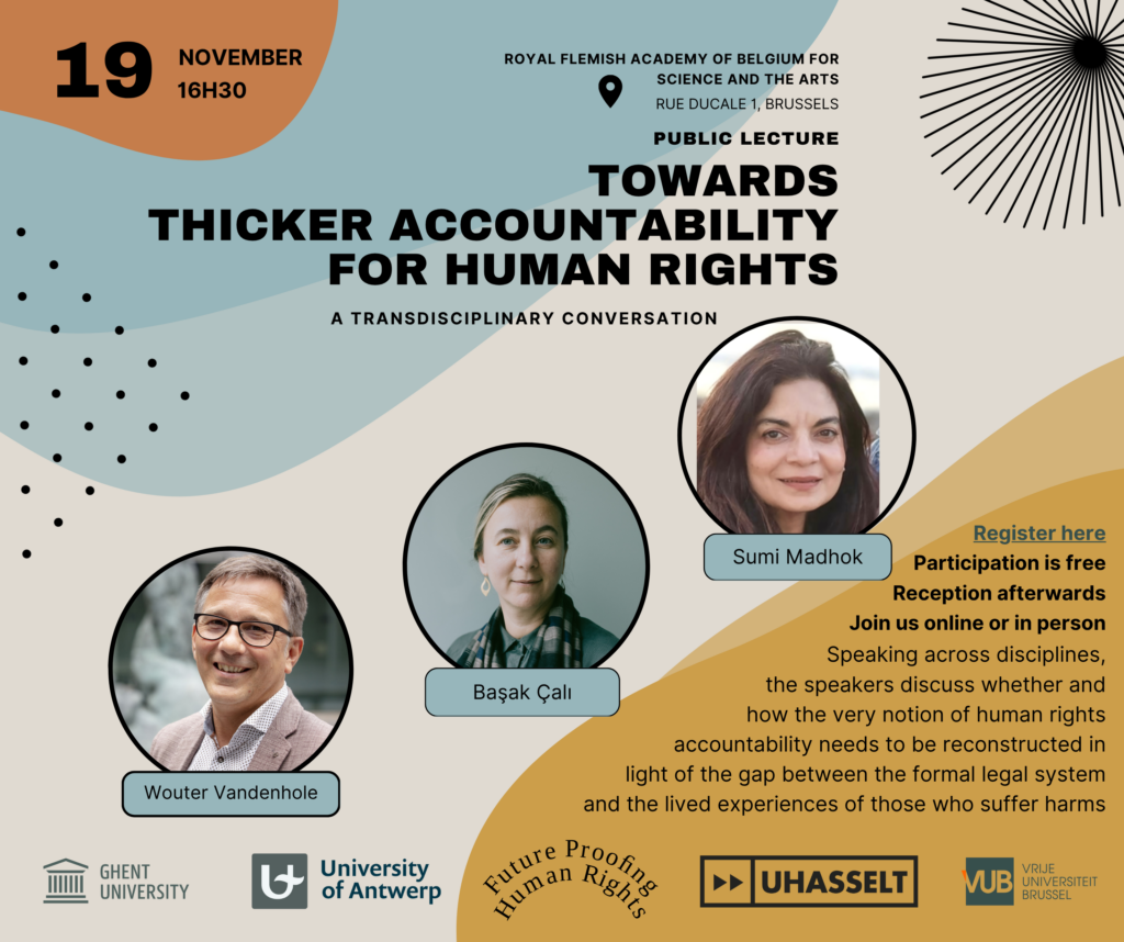As part of the closing conference of the research project ‘Futureproofing Human Rights’, the Universities of Ghent, Antwerp, Brussels and Hasselt are jointly organizing a public lecture on new ways of thinking about human rights accountability, moderated by Prof. Wouter Vandenhole. During the event, Sumi Madhok (LSE) and Başak Çalı (University of Oxford) explore what it means to develop richer, more substantive frameworks for human rights accountability that transcend the boundaries between law, politics, and moral claims.